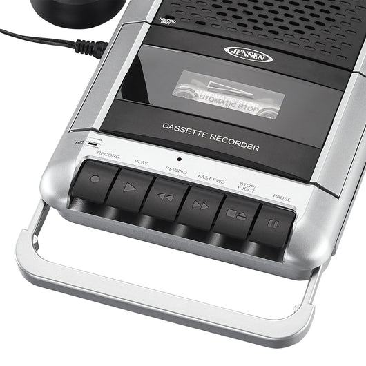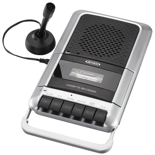 JENSEN® brings back an old favorite with the MCR-100 “shoebox” style Cassette Player/Recorder. The unit includes a top loading cassette deck that both plays and records along with a retractable carrying handle for taking it with you! The unit features easy to use buttons, a one-touch record button, and an automatic voice level control. You can record using the built-in microphone or the included external microphone with handy desk stand. A headphone jack is included for private listening, and you can attach other players to the unit using the auxiliary line-in jack. The MCR-100 operates on four (4) x "C" size batteries (not included) or with the AC adaptor (included).