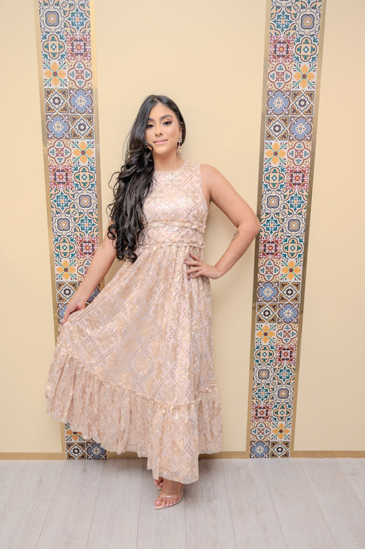 Gold Tied Back Sequin Ruffle Dress